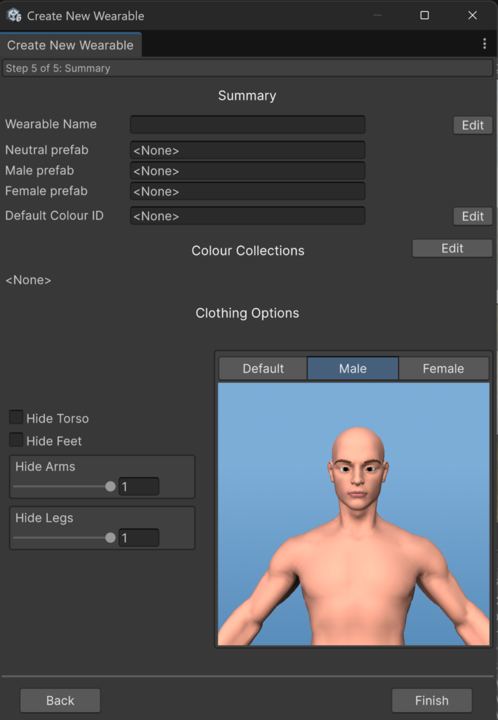 De tweede opdracht waar ik aan gewerkt heb was een editor tool. Bij StudioXR hebben ze een opdracht lopen voor de gemeente Groningen. Voor dit project waren ze aan het werken aan een Character Customisation Menu. Bij het customisen van een karakter horen ook kleding stukken. Ik was niet verantwoordlijk voor het maken van de kledingstukken, maar het was mijn taak om een editor-tool te maken die makkelijk van een FBX een kledingstuk dat gebruik kan worden in de customiser maakt. Het idee is simpel, het art-team maakt een kledingstuk en importeert het als een FBX in het Unity project. Vervolgens openen ze de tool, selecteren ze de FBX die ze willen omzetten en passen ze een paar parameters aan zodat het kledingstuk er goed uitziet op het karakter. Daarna klikken ze op een knop en het kledingstuk wordt van FBX omgezet naar een prefab met de nodige scripts en een wearable ScriptableObject wordt gemaakt met de parameters gezet en een verwijzing naar de prefab.